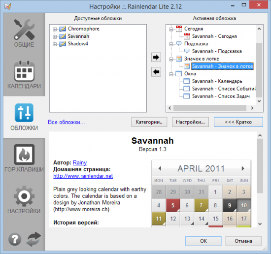 - если скачать бесплатно Rainlendar 2.15.2, можно настраивать встроенные скины, которые можно устанавливать, чтобы изменять внешний вид ПО, — требуется кликнуть по календарю и в настройках выбрать нужный скин или скачать из интернета;